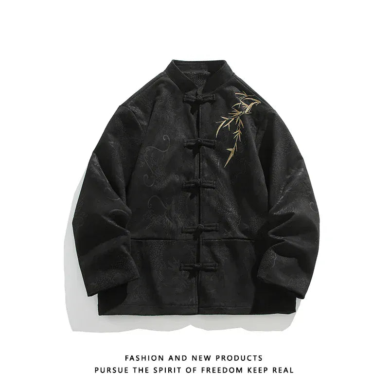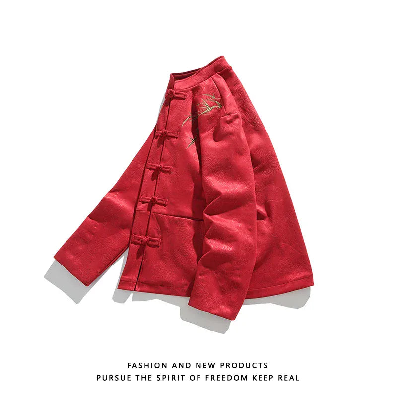 This Men’s Embroidered Suede Jacket blends traditional Hanfu aesthetics with modern urban edge. Featuring a bold embroidered collar, classic button-up design, and rich black & red suede tones, it’s perfect for standing out with heritage-inspired style.